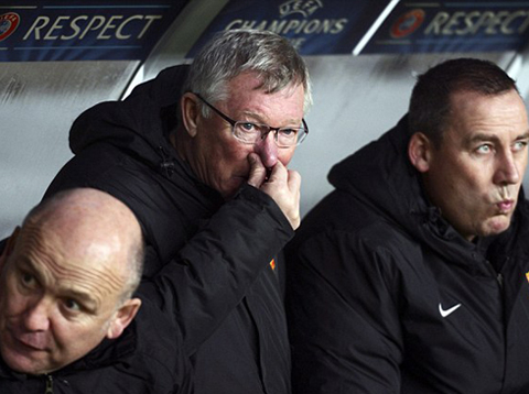 Sir Alex Ferguson cùng các trợ lý trong trận đấu gặp Braga đêm qua.