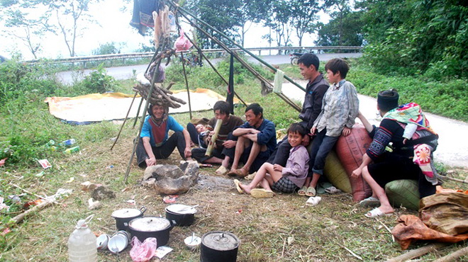 Một gia đình người Dao sơ tán trâu xuống vùng thấp tránh rét - Ảnh: Hồng Thảo