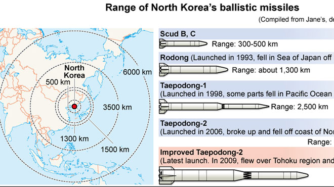 Tầm bắn các tên lửa của CHDCND Triều Tiên. Từ trên xuống: Tên lửa Scud B,C có tầm bắn 300-500km. Tên lửa Rodong được phóng năm 1993 và rơi ở ngoài khơi biển Nhật Bản, có tầm bắn 1.300km. Tên lửa Taepodong-1 được phóng năm 1998, một số bộ phân rơi xuống Thái Bình Dương, tầm bắn 2.500km. Tên lửa Taepodong-2 được phóng năm 2006, rơi xuống ngoài khơi biển CHDCND Triều Tiên, tầm bắn trên 6.700km. Tên lửa Taepodong-2 cải tiến là tên lửa mới được phóng hôm 12-12 - Ảnh: Asahi
