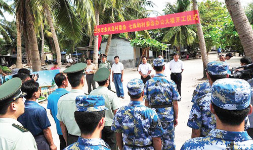 Giới chức và lính Trung Quốc dự lễ khởi công phi pháp ở Phú Lâm - Ảnh: Chinanews.com
