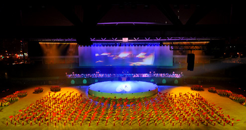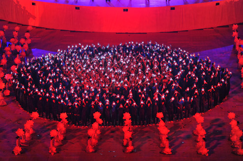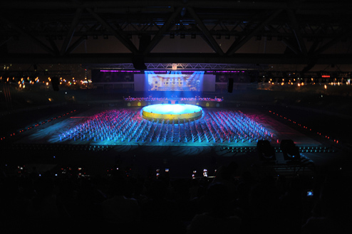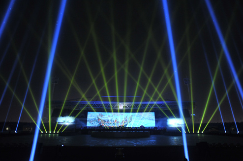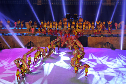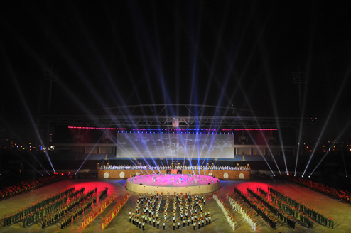 Tối 6/10, gần 8.000 nghệ sĩ thể hiện các vở diễn kể về lịch sử VN cùng những màn trình chiếu ánh sáng laze tại buổi tổng dượt đêm hội văn hóa trên sân vận động Mỹ Đình (Hà Nội).