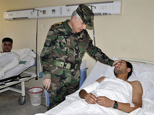 Tổng tư lệnh Quân đội Syria - Tướng Ali Abdullah Ayyoub thăm một binh sĩ bị thương hôm 6-5. Ảnh: Reuters