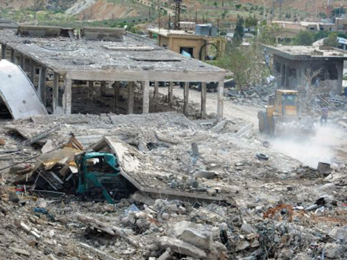 Một khu vực được cho là bị tàn phá bởi một vụ không kích Israel gần Damascus, Syria hôm 5-5. Ảnh: REUTERS