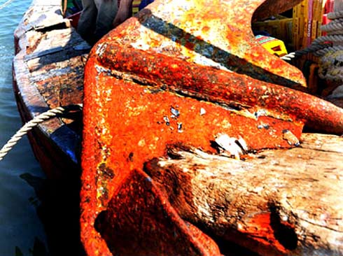 Sau khi bị tàu sắt 264 Trung Quốc đâm, mỏ neo tàu cá của ông Quang cắm sâu vào thành tàu. Ảnh: Trí Tín.