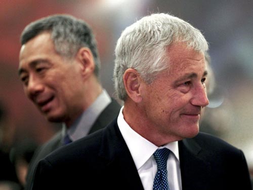 Bộ trưởng Quốc phòng Mỹ Chuck Hagel (trái) và Thủ tướng Singapore Lý Hiển Long. Ảnh: AP