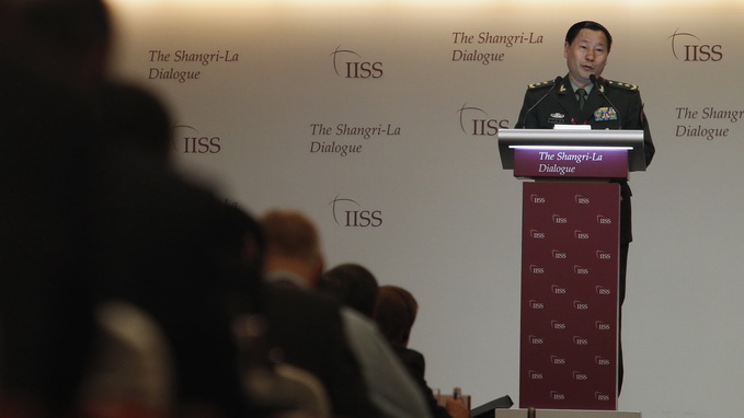 Trung tướng Thích Kiến Quốc phát biểu tại Đối thoại Shangri-La ngày 2-6 - Ảnh: Reuters