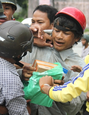 Những người dân nhận tiền ra khỏi cổng đã bị nhiều người xưng là chủ nợ nhào đến giành giật, bất chấp sự có mặt của hàng chục cán bộ công an huyện Sơn Tây.