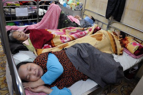 Bệnh nhân nằm ghép hai người  một giường, tình trạng phổ biến ở các bệnh viện ở Hà Nội. Ảnh: Hoàng Hà