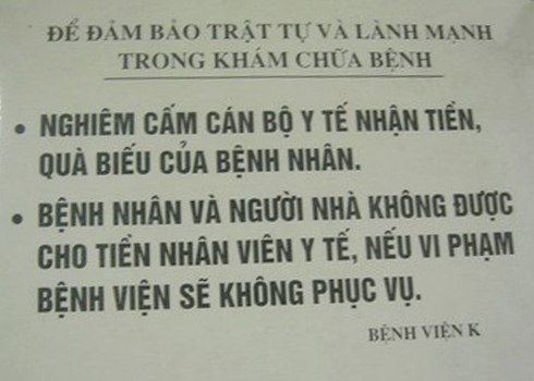 Trong một nỗ lực để ngăn chặn nạn tham nhũng, 5 bệnh viện lớn tại Hà Nội hồi năm 2011 đã quyết định triển khai một chiến dịch chỉnh đốn đạo đức và thái độ làm việc của các nhân viên y tế, trong đó bao gồm chính sách "Nói không với phong bì".