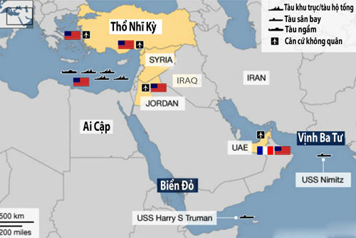 Lược đồ trận địa của Mỹ quanh Syria và Iran - Ảnh: Global Security/Đồ họa: Du Sơn